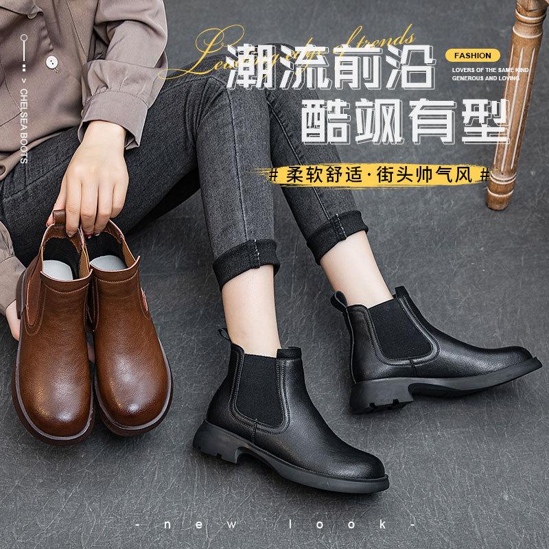 Leather Versatile Chelsea Boots Children's Soft-soled British Coarse Heel Martin Boots French Low Pile Round Head Cigarette Boots