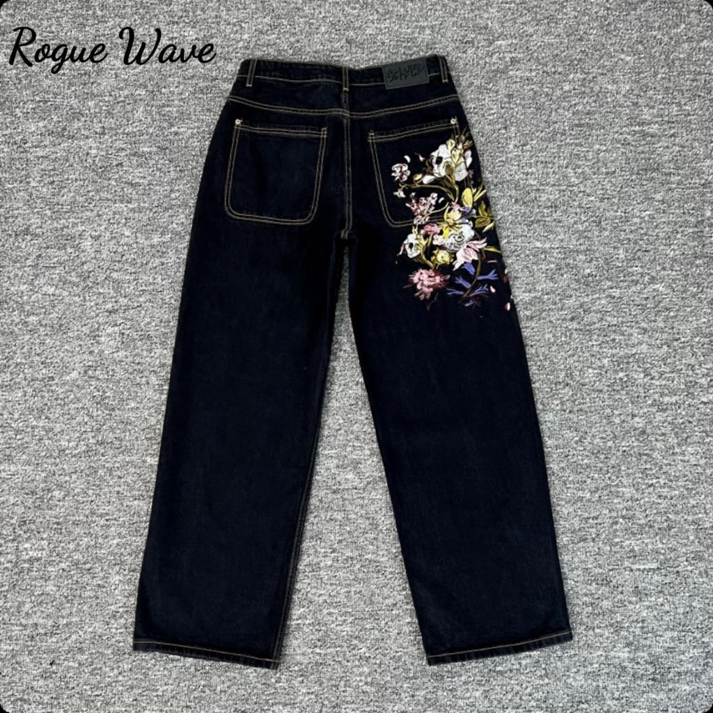 RogueWave American Retro Harajuku Floral Embroidery Baggy Jeans Men High Street Trendy Streetwear Y2K Casual Straight Pants