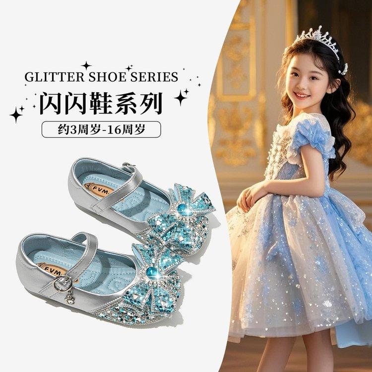 Girls Crystal Shoes Children's Princess Shoes 2025 Spring and Summer New Elsa Leather Shoes Breathable Rhinestone Blue Performance Shoes