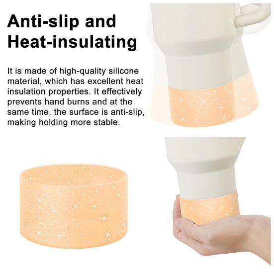 Introducing our cup sleeve, crafted from high-quality silicone material for excellent heat insulation and anti-slip properties. Say goodbye to hot hands with this sleeve that ensures a stable grip. Available in a range of soft and vibrant colors such as light blue, pink, green, orange, and gold to cater to individual preferences. The sleeve features a captivating glitter design that adds a touch of glamour with its starlight effect.