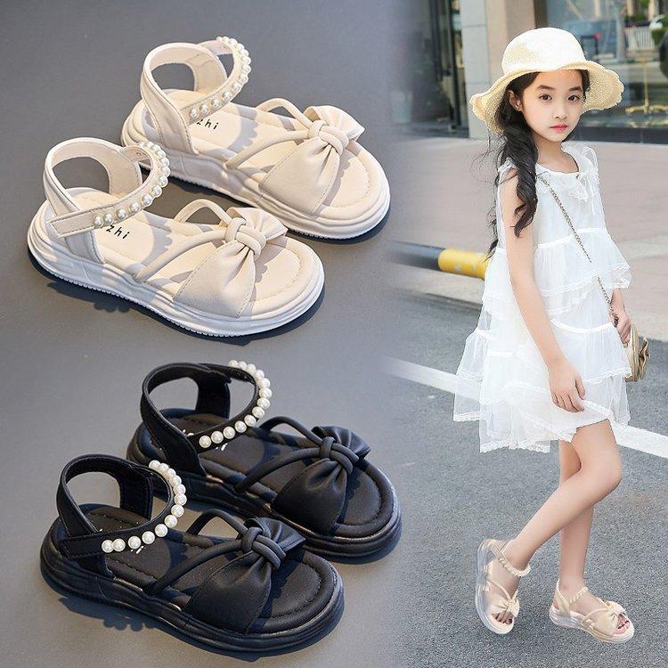 Sandals Girls 2025 New Summer Children's Fashion Pearl Princess Shoes Girls Bow Korean Roman Sandals