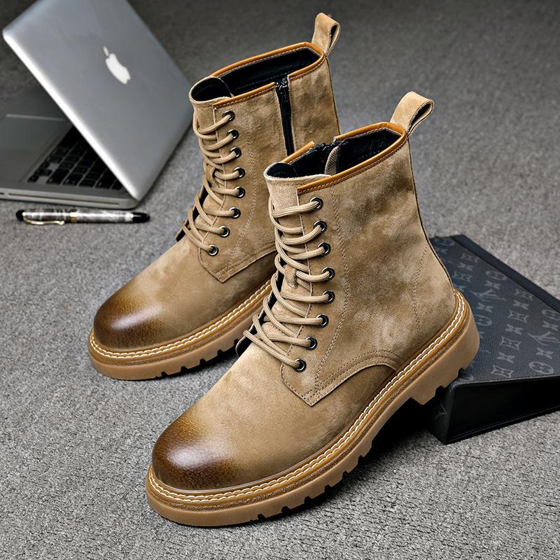 New Leather Rhubarb Boots Trendy 100 Fashion Side Zipper Tall Martin Boots Casual Versatile Lace-up Tooling Men's Boots