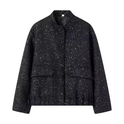 Women's Sequined Bomber Jacket Fall New Round Neck Long Sleeve Pocket Stretch Hem Sequins Jacket Coat Female Chic Outerwear
