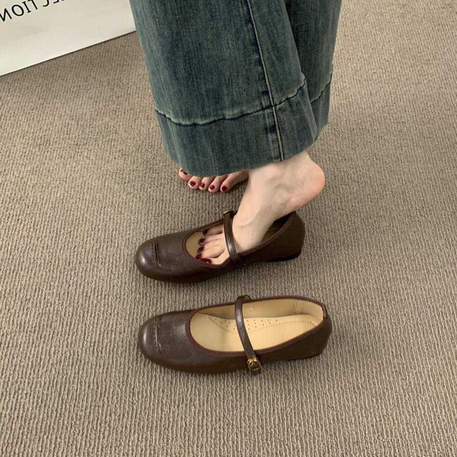 Vintage Versatile Evening Breeze One-Word Buckle with Round Head Mary Jane Shoes Commuter Small Brown Leather Shoes Ballet Shoes.
