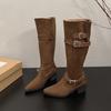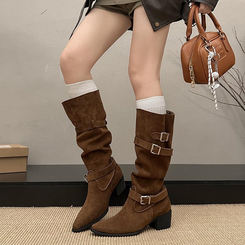 Pointed Boots Children Thick Heel Thin Pleated Piled Boots Women's 2025 Spring and Autumn Khaki Suede But Knee Boots
