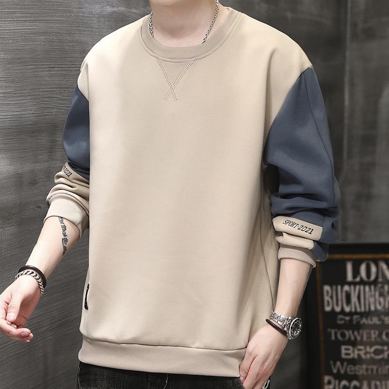 Men's Spring/Fall Long-Sleeve Loose-Fit Crew Neck Patchwork Base Layer Shirt Youthful Handsome Casual T-Shirt