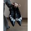 Sheepskin Version~ Leather Temperament Rhinestone Flower Pointed Single Shoes Women's French Retro Mary Jane Shoes Commuter High Heels
