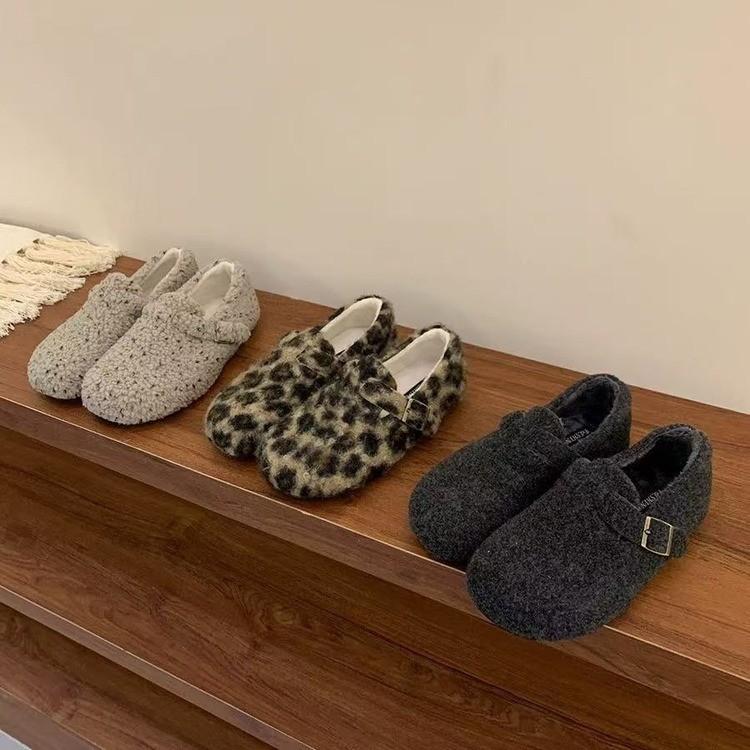 Leopard Print Mary Jane Fluffy Shoes Women's Winter 2025 New Ugly Cute Bread Cotton Shoes Velcro Flat Plush Single Shoes