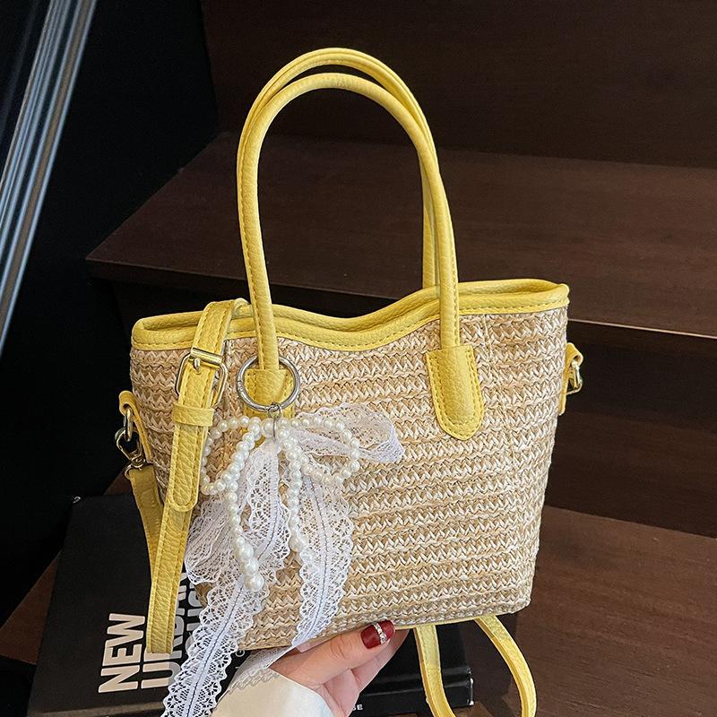 2025 New Niche Design Contrasting Colors Straw Hand-held Bucket Bag Leisure Commuting Vacation Wind Messenger Beach Bag Women