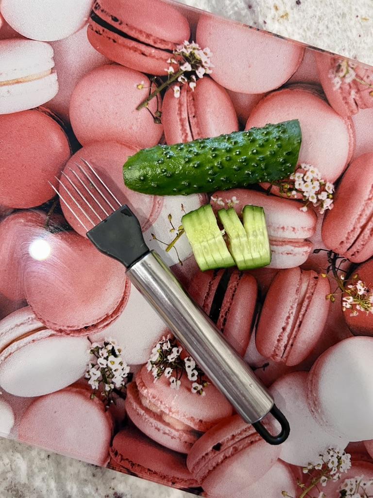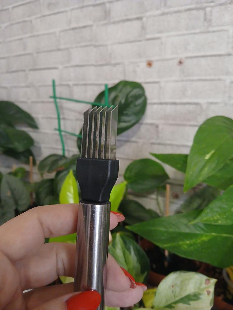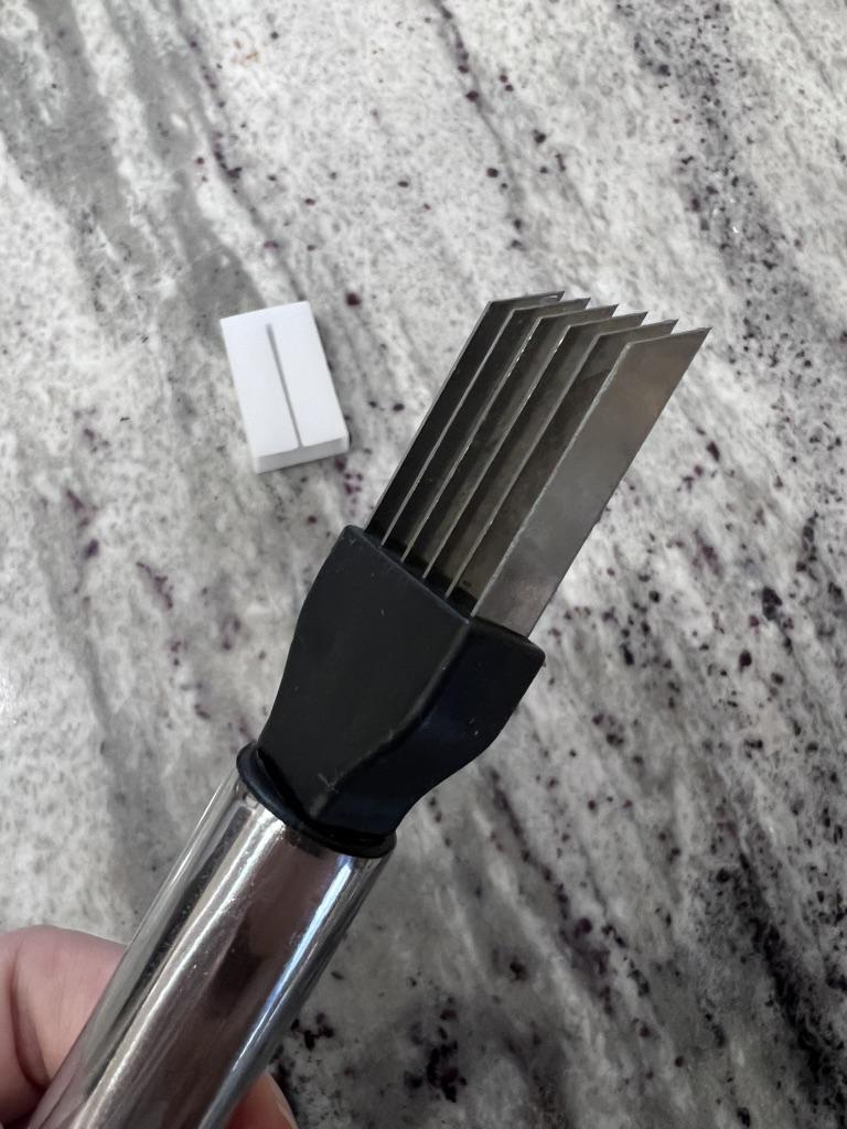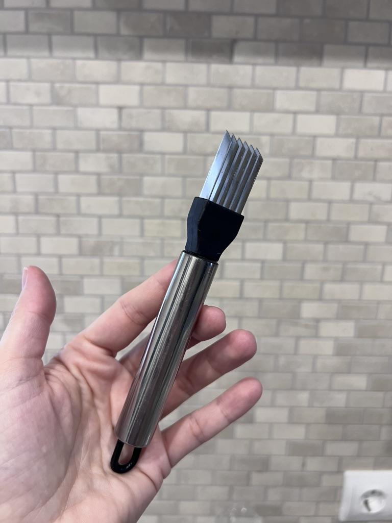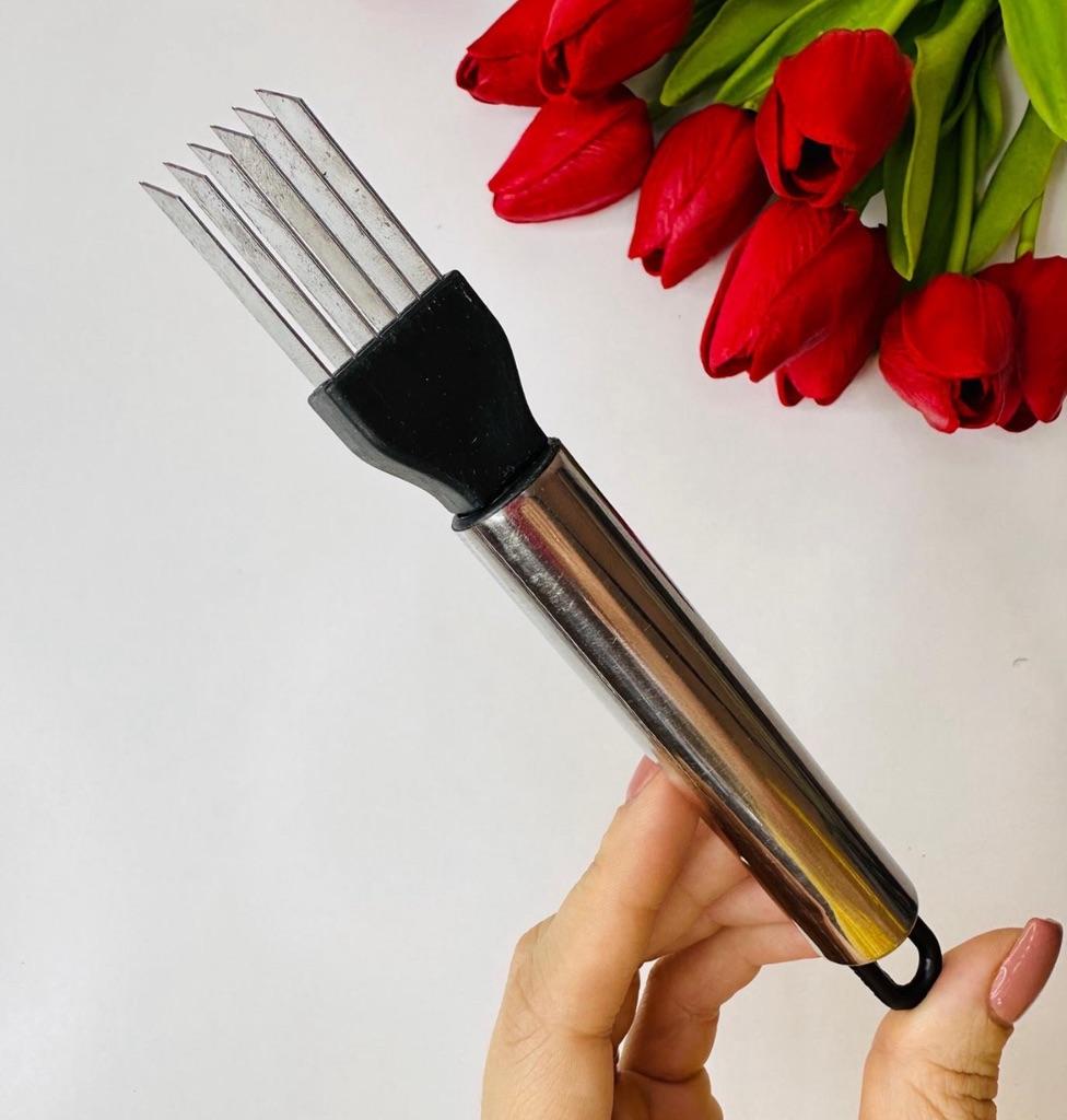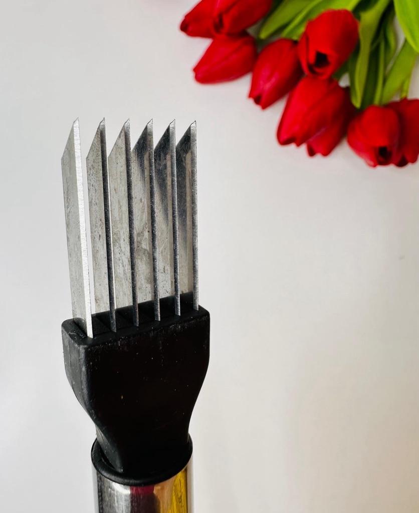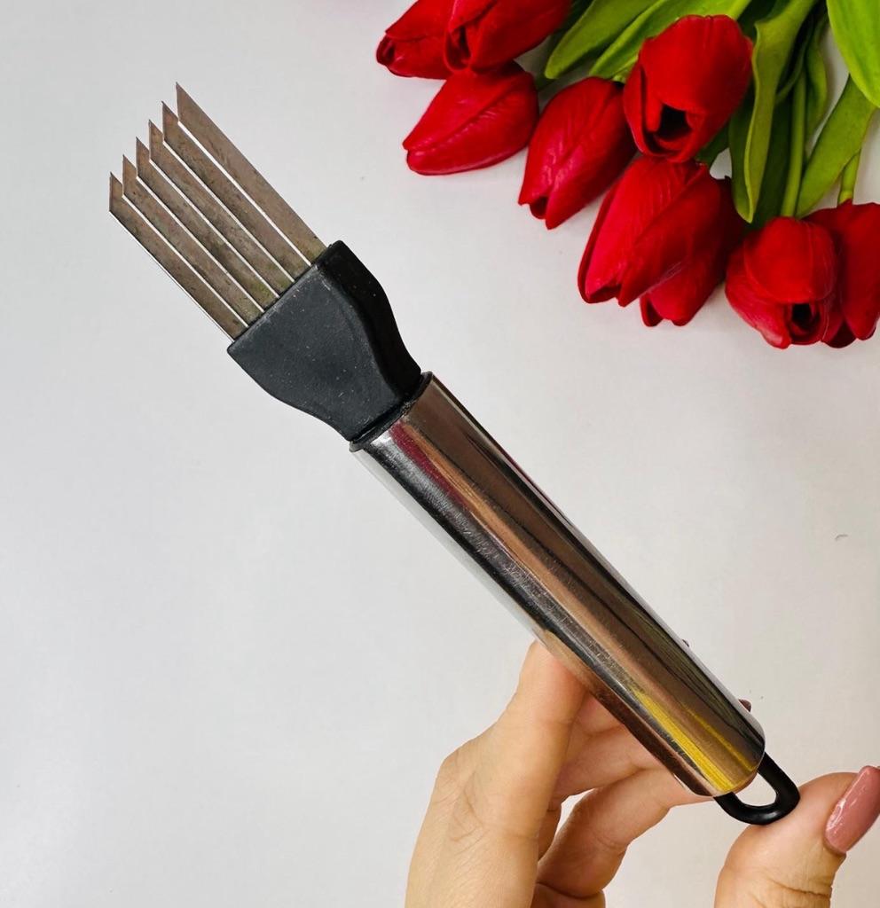 This utensil is a specialized tool designed to make fine, uniform, and quick cuts in elongated vegetables. Blade Design: Features multiple stainless steel blades arranged in parallel. This design allows for several simultaneous cuts with a single motion, ideal for creating thin or "julienne" strips.. Structure: It has an ergonomic steel handle with a circular end for easy hanging. The blades are integrated into a black plastic base that ensures stability during cutting. Safety: Includes a white plastic protective cover to cover the sharp blades while not in use, preventing accidents in drawers. Ideal Use: It is perfect for cutting chives, scallions, chilies or even for making decorative cuts in the skin of cucumbers and courgettes.