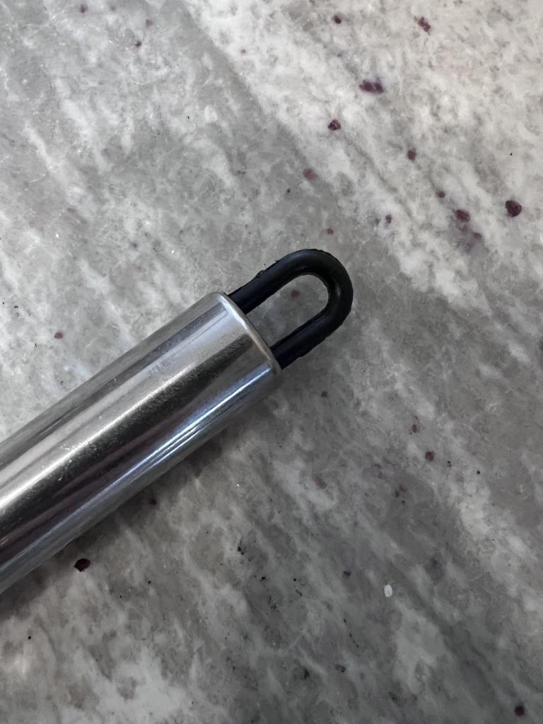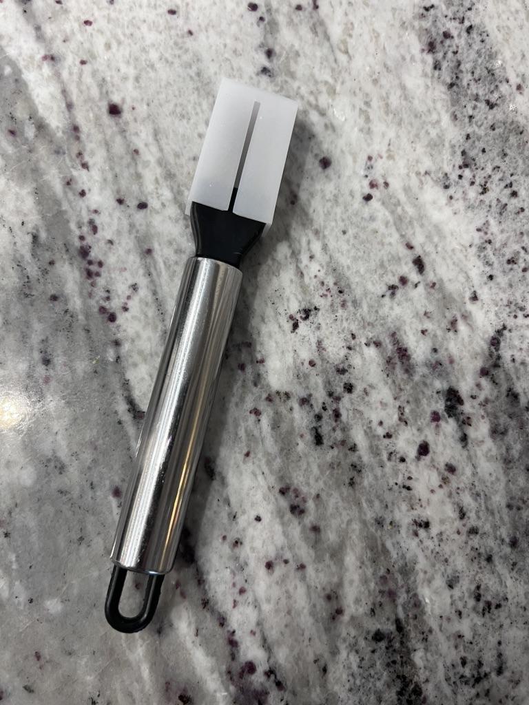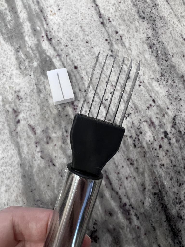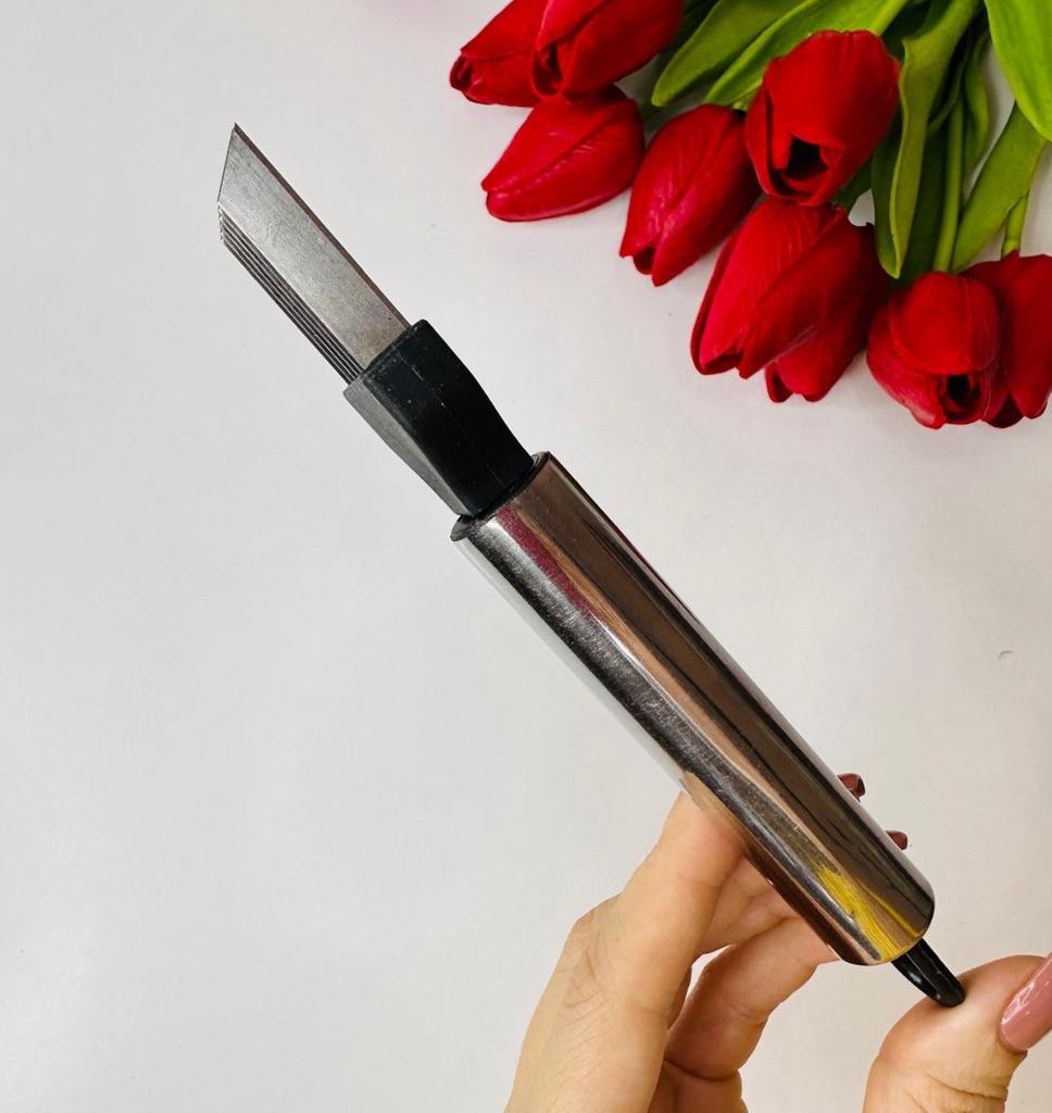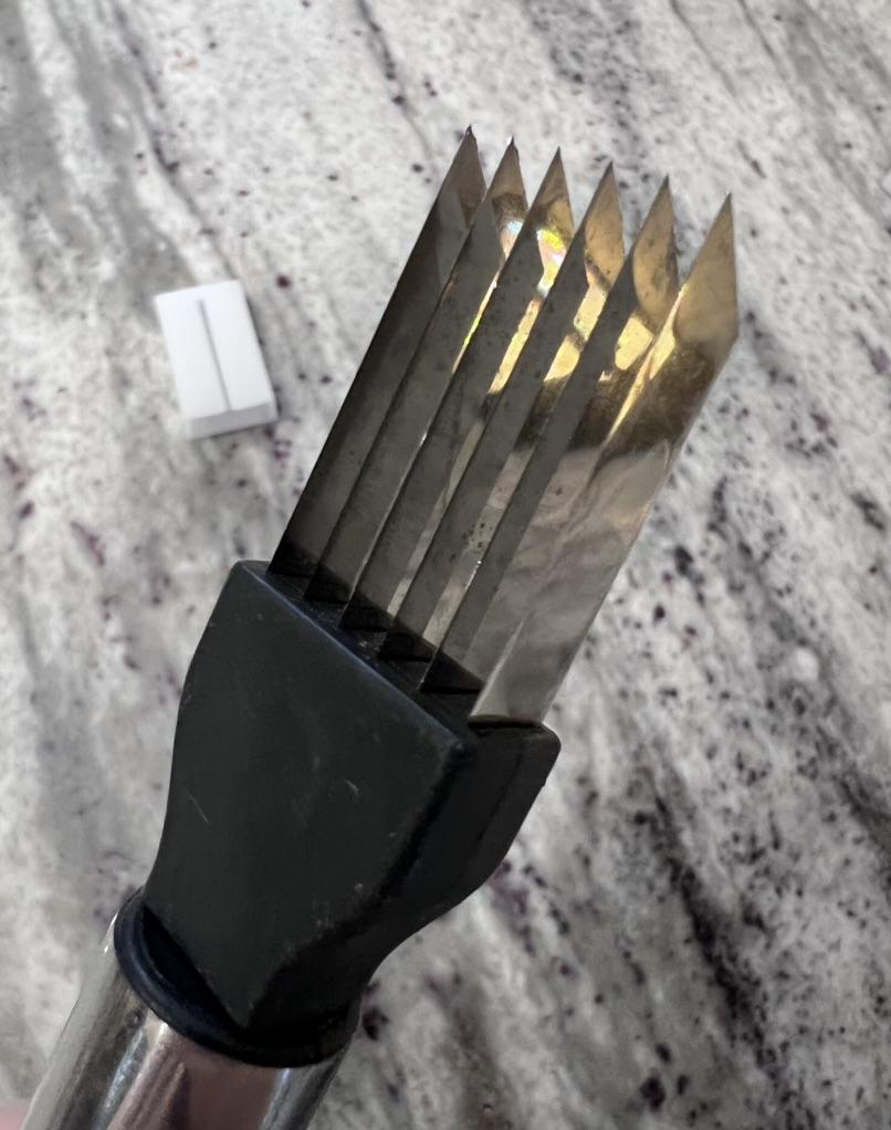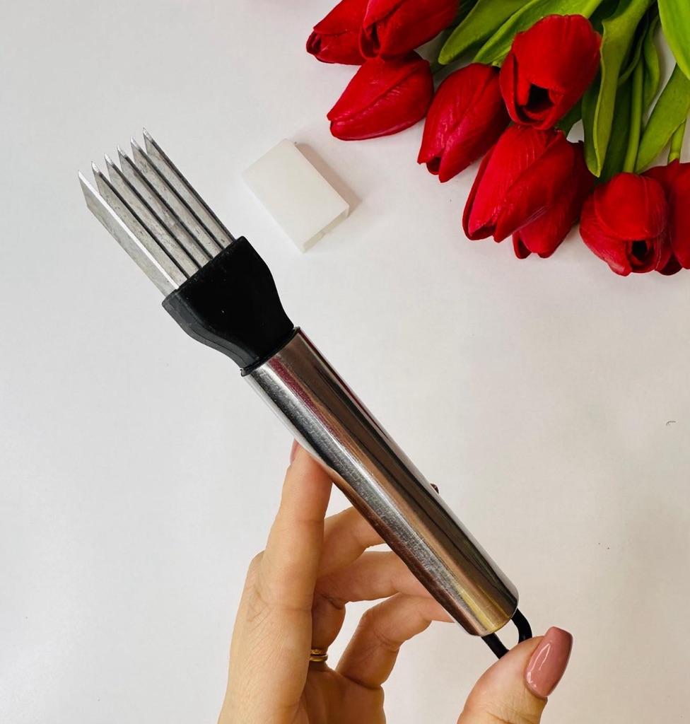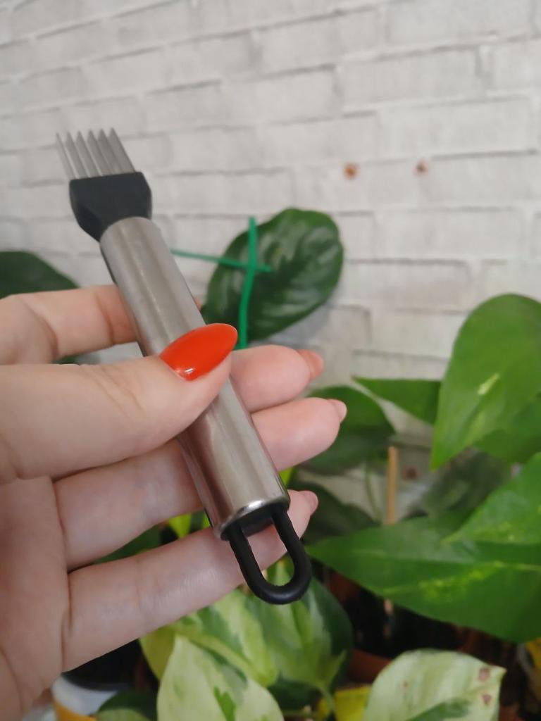 This utensil is a specialized tool designed to make fine, uniform, and quick cuts in elongated vegetables. Blade Design: Features multiple stainless steel blades arranged in parallel. This design allows for several simultaneous cuts with a single motion, ideal for creating thin or "julienne" strips.. Structure: It has an ergonomic steel handle with a circular end for easy hanging. The blades are integrated into a black plastic base that ensures stability during cutting. Safety: Includes a white plastic protective cover to cover the sharp blades while not in use, preventing accidents in drawers. Ideal Use: It is perfect for cutting chives, scallions, chilies or even for making decorative cuts in the skin of cucumbers and courgettes.