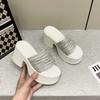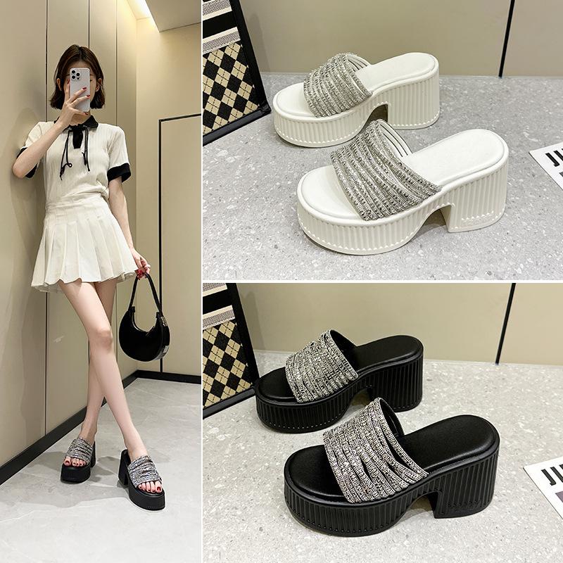 European Station 2025 Summer New Product Slope Heel Thick Bottom Heightened Feminine Rhinestone Surface One-word Slippers Wear Cool Slippers