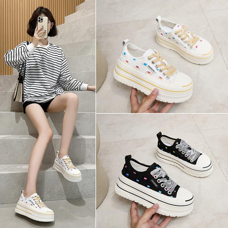 Thick-soled Heightening Canvas Shoes, Female Students' Versatile Little White Shoes 2025 New Ins Korean Version of Trendy Bag Head Casual Shoes