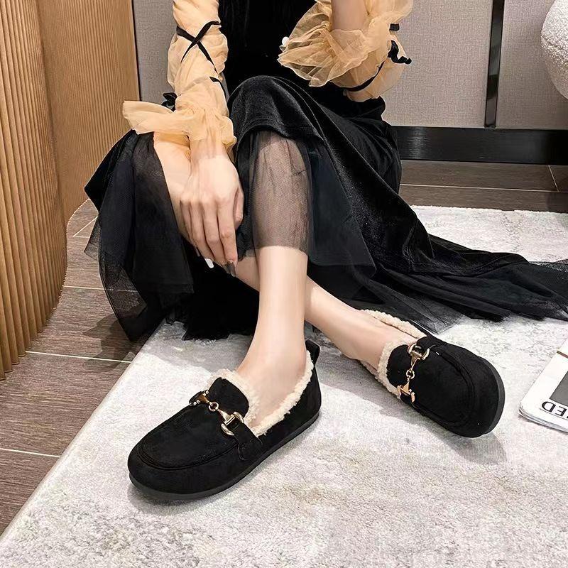 Mao Mao Shoes Women's Winter Retro Flat-soled Soft-soled One-pedal Plush Warm Cotton Shoes Wear Loafer Beanie Shoes
