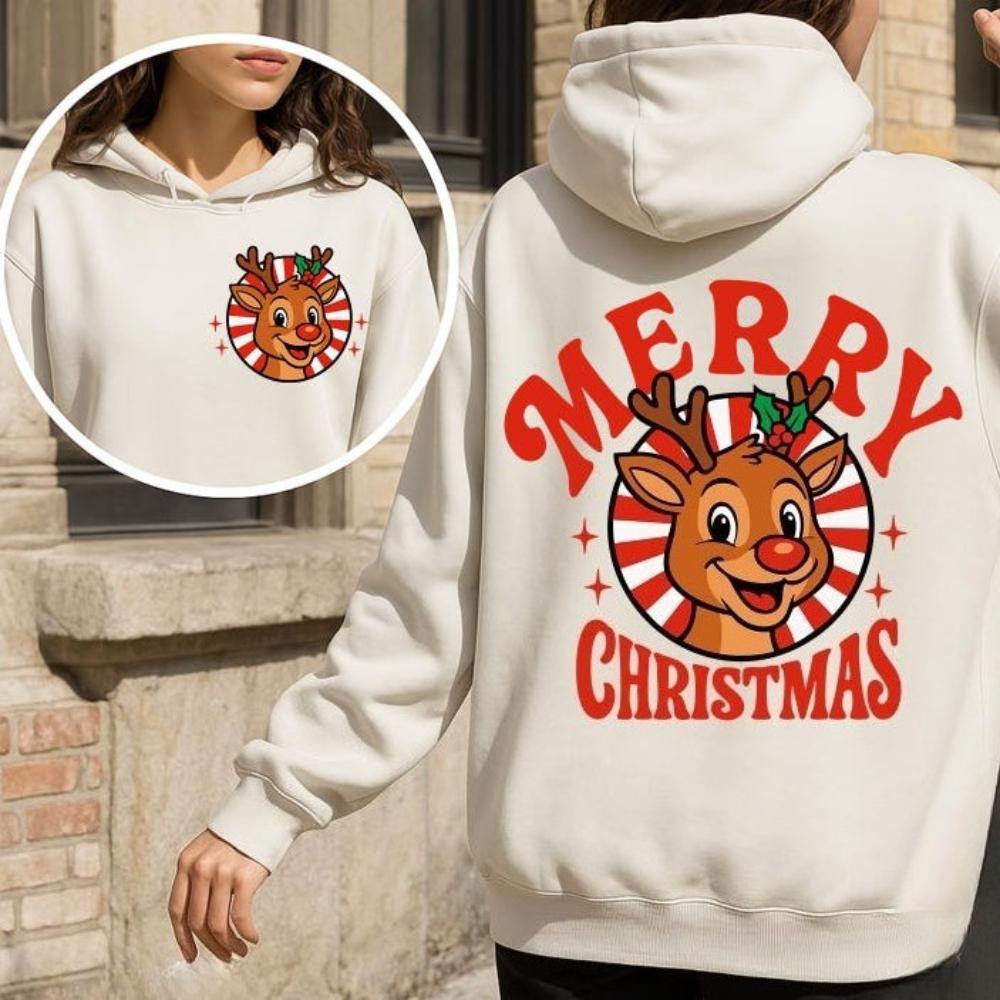Retro Merry Christmas Reindeer 2-Sided Graphic Women Hoodies Vintage Christmas Reindeer Tops Festive Christmas Women's Clothing
