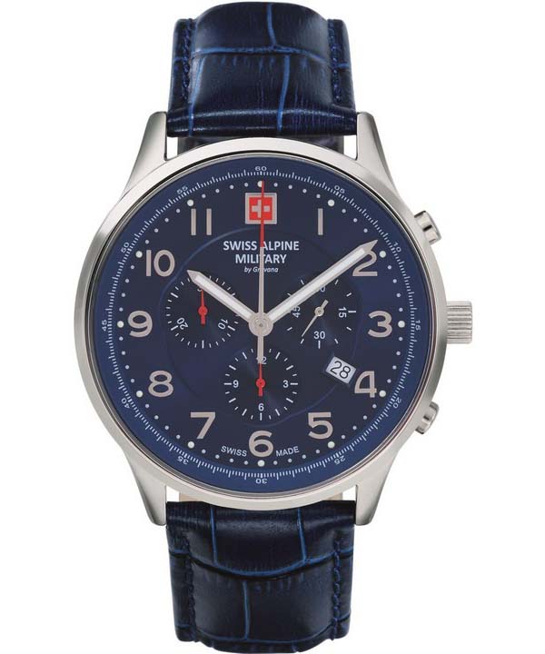 Swiss Alpine Military Skymaster Chronograph Leather Strap Blue Dial Quartz 7084.9535 100M Men's Watch