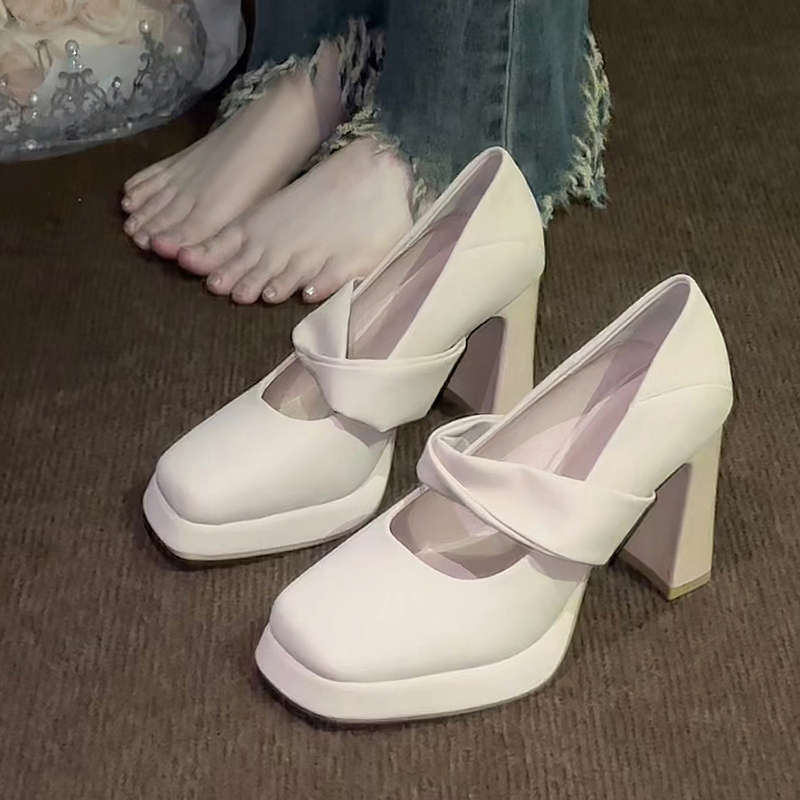 Small One-word Buckle High Heels Women's Thick Heels Single Shoes Bridesmaid Shoes Square Head Waterproof Table Thick-soled Mary Jane Shoes