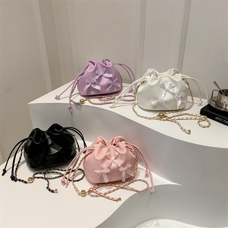 2025 Summer Model, Bow Small Fresh Draw Belt Large Capacity Soft Surface Pleated Chain Bucket Crossbody Shoulder Women's Bag