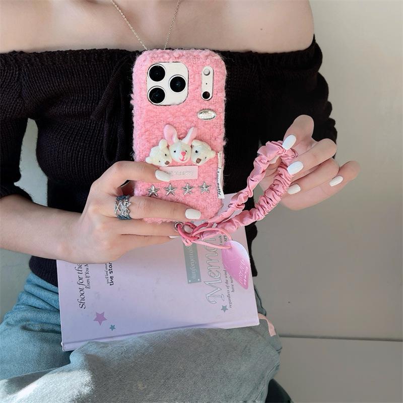 Lambswool Plush Bear and Rabbit Head Case for iPhone 17/16 Pro Max/15/14