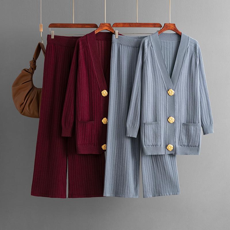 Autumn and Winter New Solid-color Loose Metal Button Cardigan Set and Wide-leg Pants Two-piece Set for Women