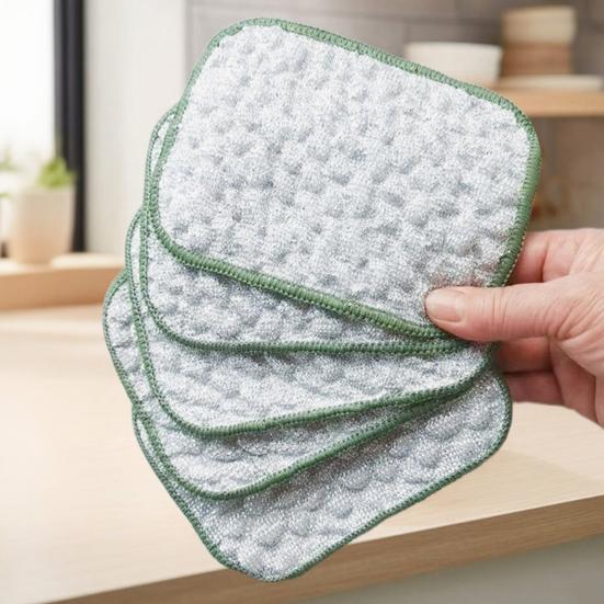 Introducing our dishwashing cloth, made from wood fiber material for a safe and environmentally friendly cleaning experience. With silver silk fabrics providing excellent friction, enjoy 50% more cleaning power to tackle dirt effectively. The double-sided design features a stainless steel surface for quick and scratch-free cleaning, along with a multi-layer cotton thread side that absorbs 3 times more water and oil. Measuring 4.6*6.3 inches, this cloth offers a large cleaning area for quick and efficient cleaning in the kitchen, bathroom, or any space in your home. The unique porous cotton thread structure is oil-resistant and produces 2 times more foam than traditional fabrics, making cleaning a breeze. Upgrade your cleaning routine with our versatile dishwashing cloth today!