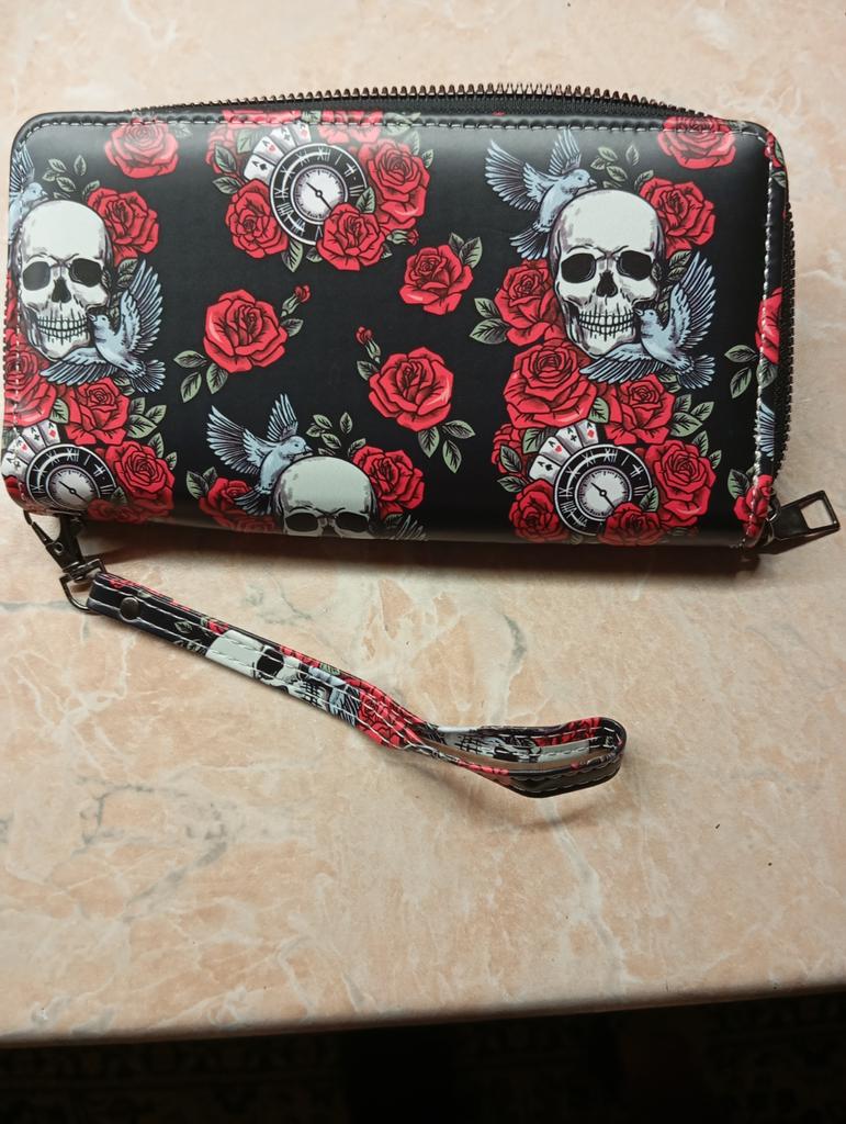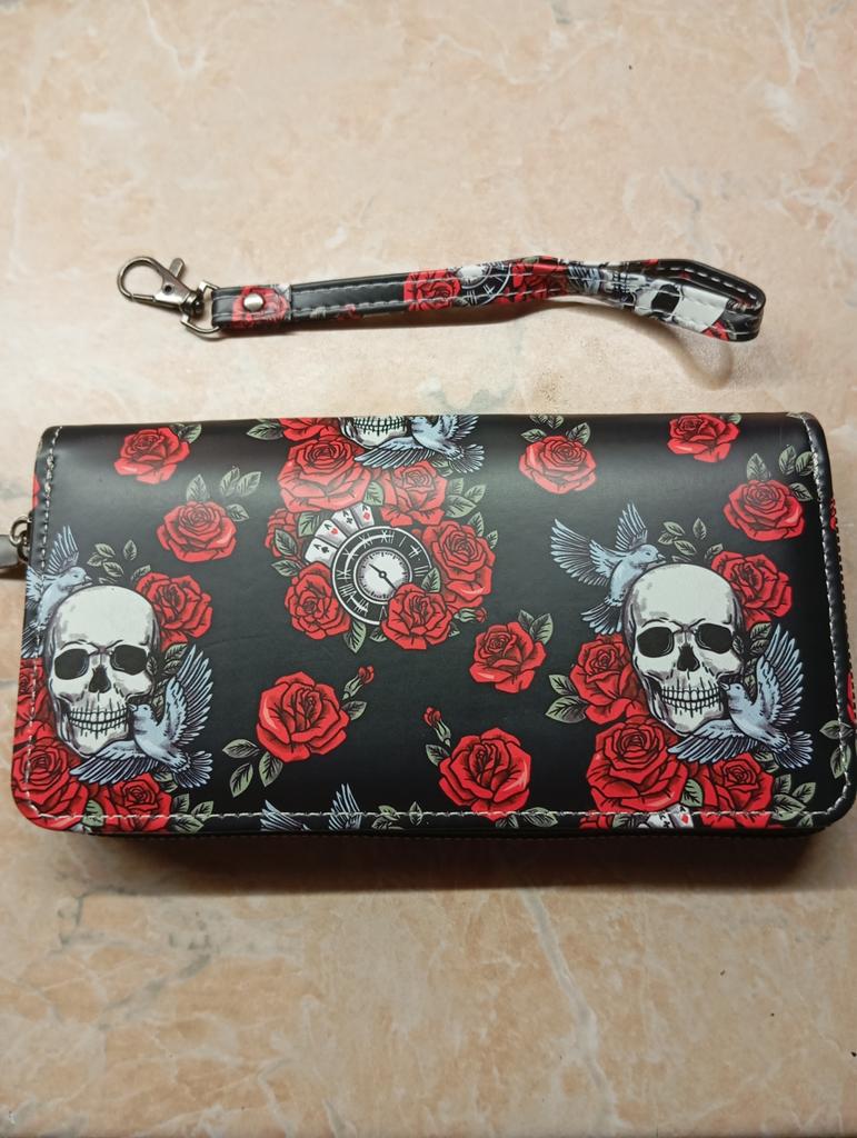 Halloween Gift Idea Long Wallet with Skull and Rose Print, Featuring Wristband, Punk Style, In Various Colors Including Black and Red.