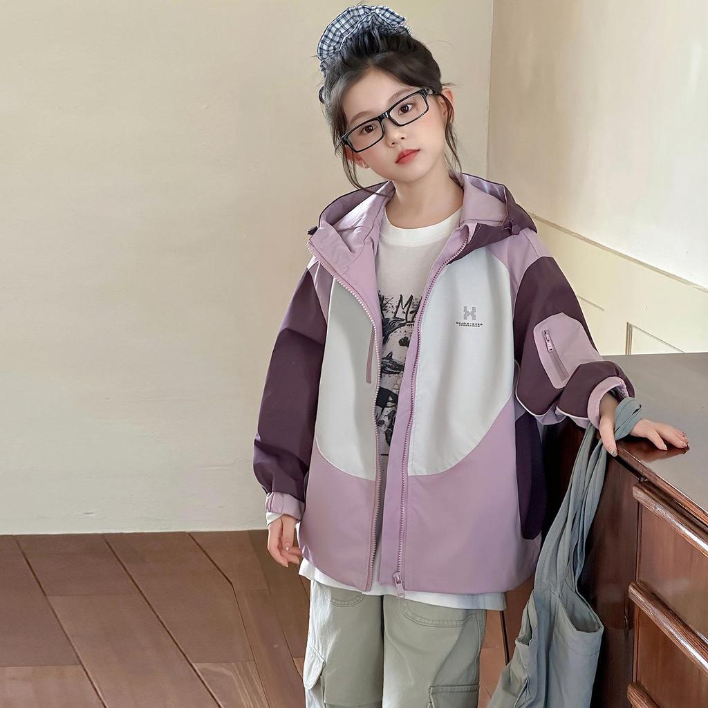 Girls' Color Block Hooded Windbreaker - Spring/Autumn 2025 Casual Sports Jacket for Big Kids