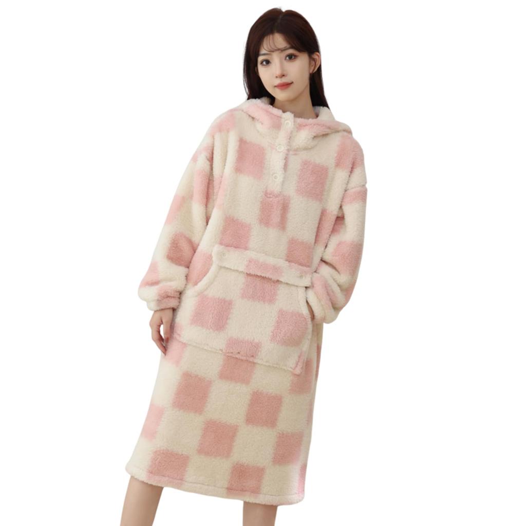 Actowa Fluffy Boa Checkered Plus One Loungewear/Room Dress, Pajamas, Pattern, Sizes, Thick, Warm, Cute, Loungewear, Nightgown, Fall/Winter (Pink,