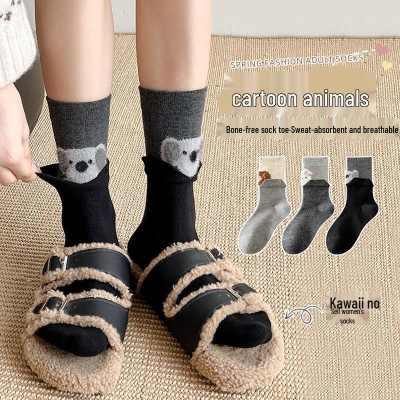 Women's Gray Mid-Calf Cartoon Socks - Cute College Style for Spring & Autumn