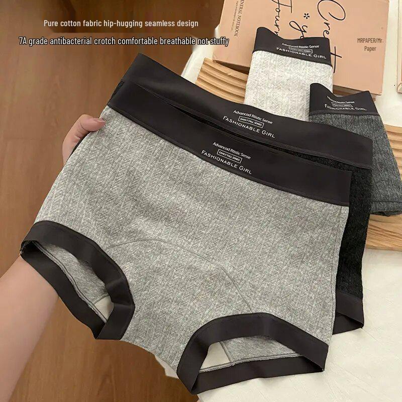 Gray Antibacterial Women's Pure Cotton Seamless Boxer Briefs - Mid-Waist, Breathable, Comfortable, Hip-Wrapping Underwear.
