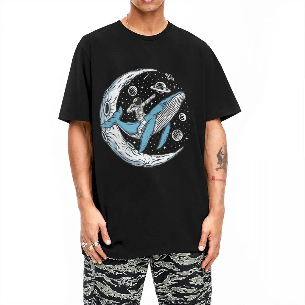 Astronaut Riding A Blue Whale Near The Crescent Moon T-Shirt Summer Vintage T-Shirts Hipster Tee Shirt For Men