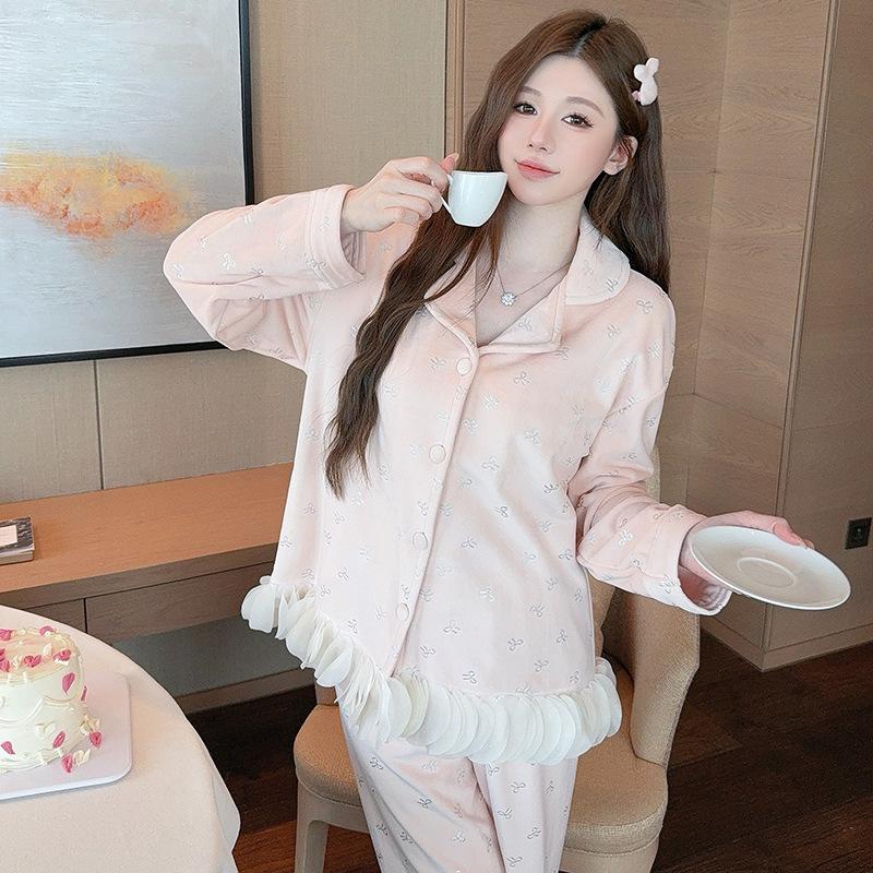 Women's Sea Island Cotton Pajamas - Long-Sleeve Lace Loose Fit Plus Size Student Loungewear