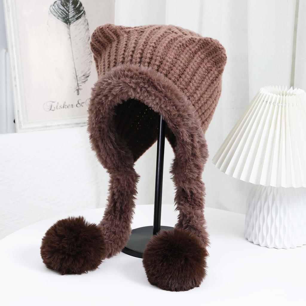 The New Autumn and Winter Cat Ear Double Tail and Two Wool Knitted Cap Is Windproof Ear Protecting Warm Fashionable Versatile and Cute Woolen Cap