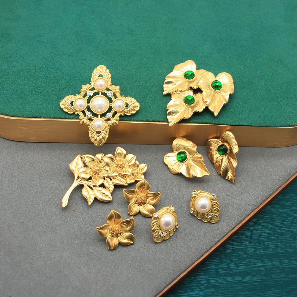 Medieval Jewelry Matte Real Gold Electroplating Brooch Earrings Set Qingdao Design Light Luxury High-End Earrings