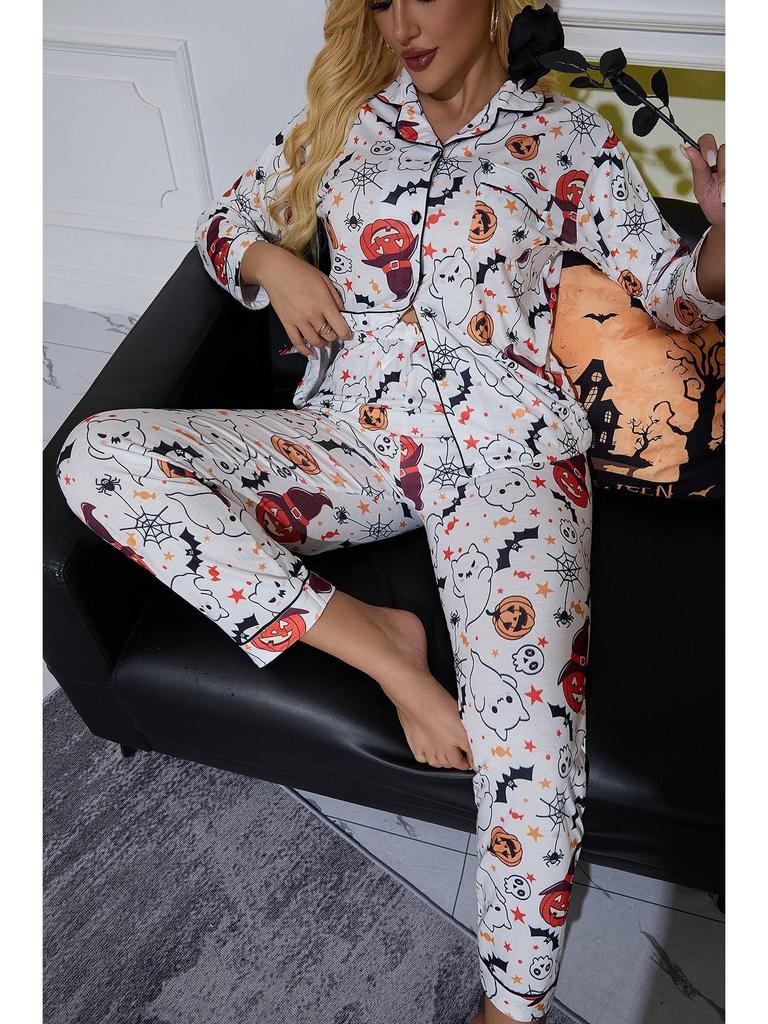 Get into the festive spirit with this cozy and stylish pajama set, perfect for Halloween nights at home. Crafted from soft polyester material and imitation cotton milk silk, this set ensures comfort and durability. The long-sleeve cardigan with a lapel design offers a relaxed fit, while the matching long pants provide complete coverage, keeping you warm and comfortable. With its fun pumpkin theme, this homewear set is ideal for lounging or sleep, making it a delightful addition to your seasonal wardrobe.