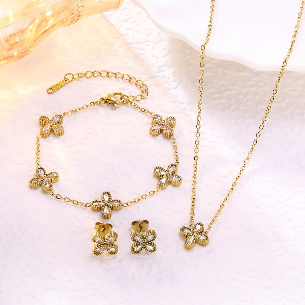 Trendy High-End Zircon Titanium Four-Leaf Clover Jewelry Set: Necklace, Bracelet, Earrings for Women