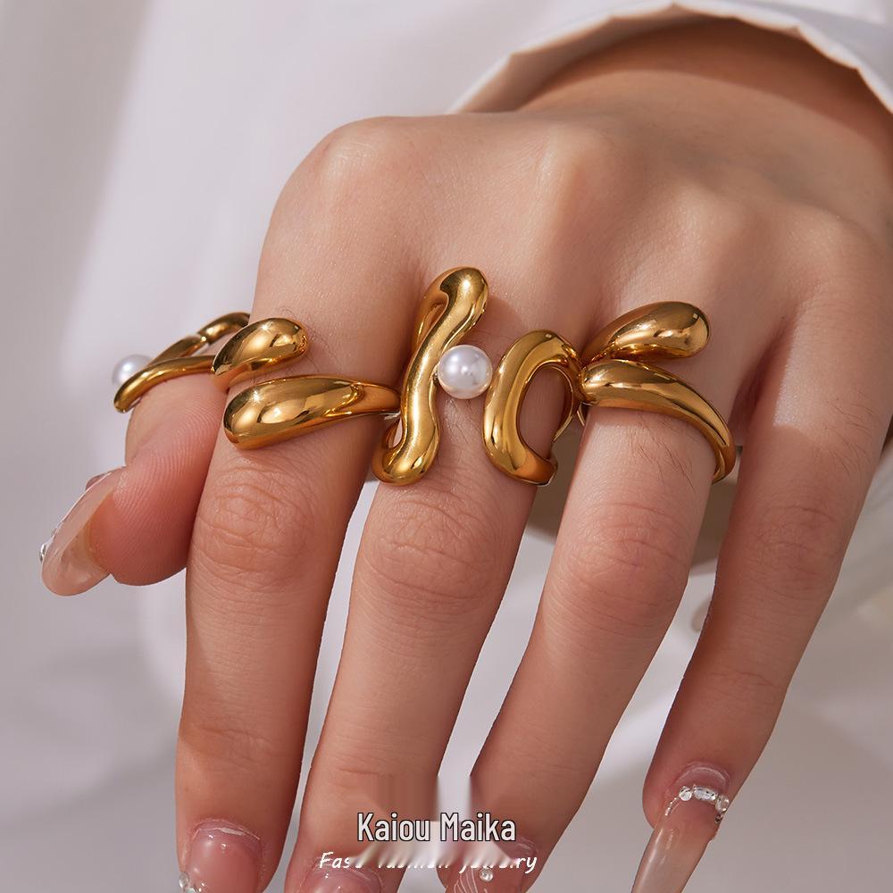 Oumaijia Stainless Steel Geometric Pearl Open Ring - Fashionable Non-fading Jewelry