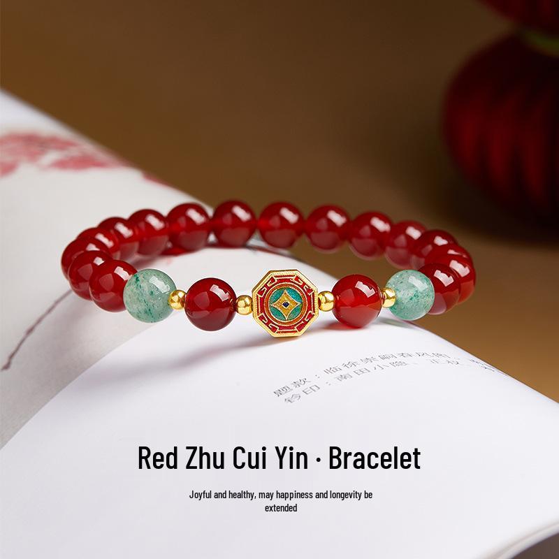 Red Agate & Green Strawberry Crystal Beaded Bracelet with S925 Sterling Silver and Enamel, Vintage Women's High-End Jewelry.