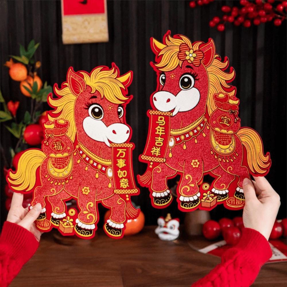 1 Pair 3D Horse Year Door Sticker Glitter Zodiac Horse Windows Decals Door Couplet Market