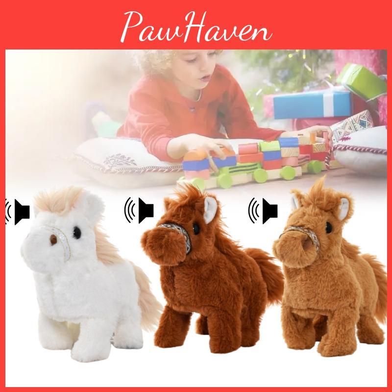 The Realistic Robot Pony is a plush toy that features walking functionality, bringing a lifelike experience. Made of soft fiber cotton with a long plush exterior, it measures 20*17*10cm. Powered by two AA batteries not included, it is ideal for childrens play and collection. Wipe clean with a damp cloth to maintain its appearance.