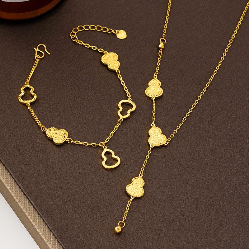 Vietnam Gold Bracelet & Tassel Necklace Set: Luxurious Gourd Design with Crushed Ice Accents