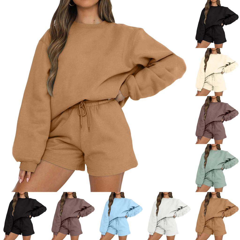 Women's Comfortable Casual Fashionable Solid Color Round Neck Sweatshirt Shorts Two-piece Set