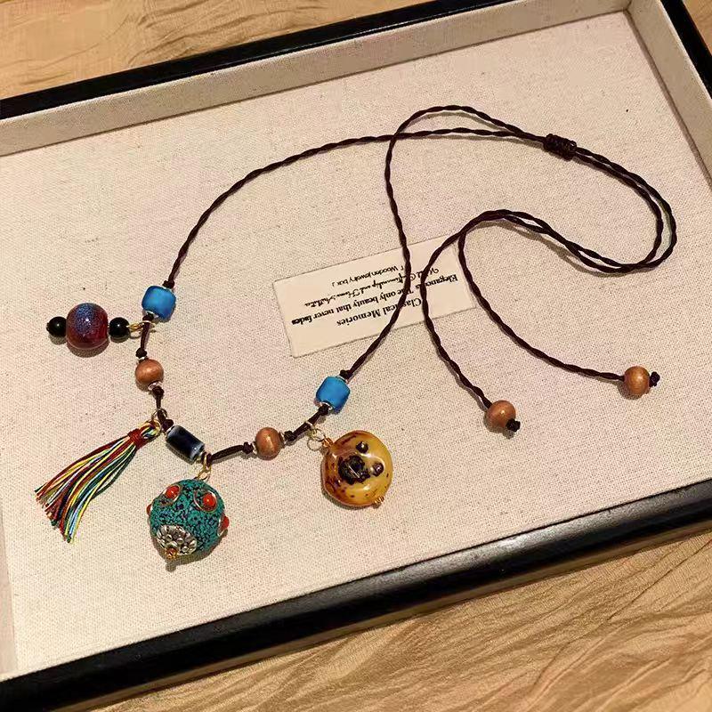 Ethnic Retro Tibetan-Style Lantern Necklace - Women’s Long Sweater Chain with Cotton Linen Accents