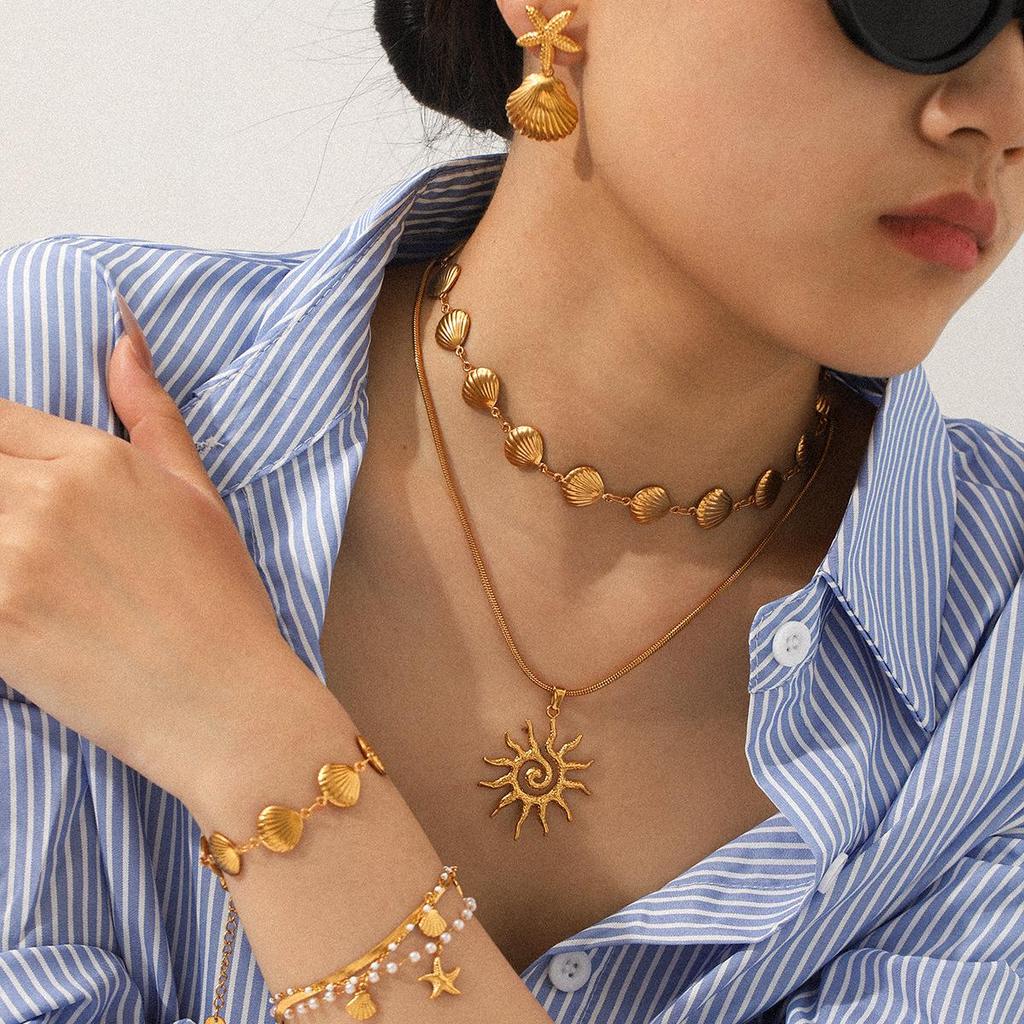 Ocean-Inspired 18k Gold Plated Starfish & Seashell Jewelry Set (Stud Earrings & Conch Pendant Necklace)
