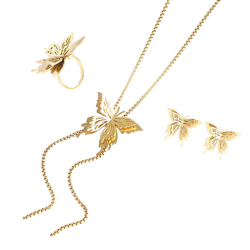 18K Gold Plated Titanium Jewelry Set: Pull-out Butterfly Necklace, Tassel Earrings, Luxury Studs, and Sweater Chain Ring