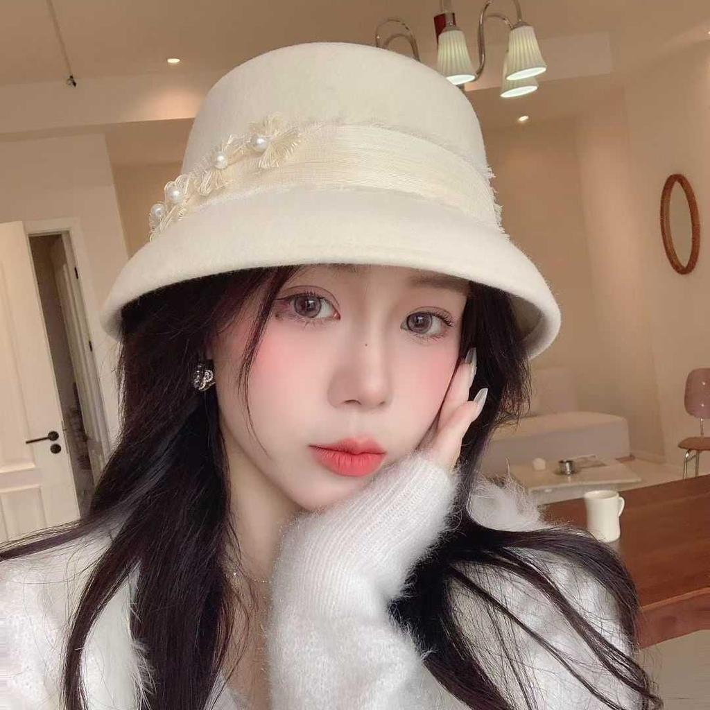French Romantic Floral Wool Fedora: Women's Autumn/Winter Elegant Small Face Lampshade Socialite Bucket Hat.