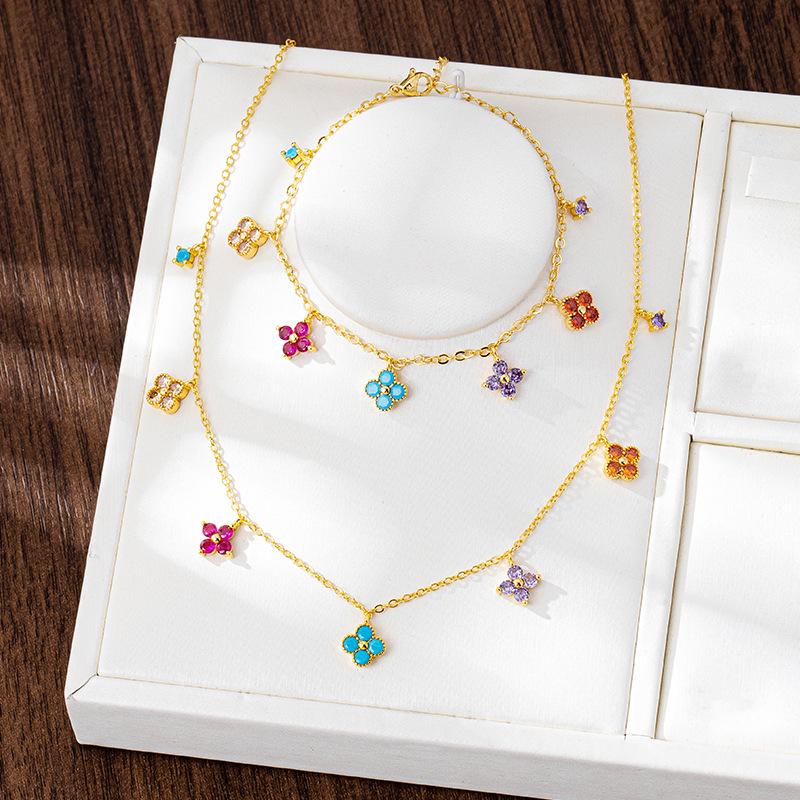 Vietnam Gold Minimalist Four-Leaf Clover Necklace & Zircon-Inlaid Flower Bracelet Set