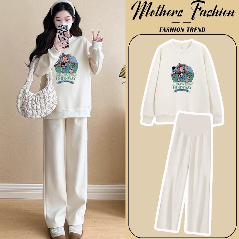 Introducing a comfortable and stylish maternity set designed for modern, expecting mothers. This set includes an apricot round neck printed sweatshirt paired with loose-fitting pants, offering both comfort and a chic look during pregnancy. Made from soft, high-quality cotton, the material ensures breathability and ease of movement. Perfect for lounging or casual outings, this maternity set provides a delightful blend of style and practicality.