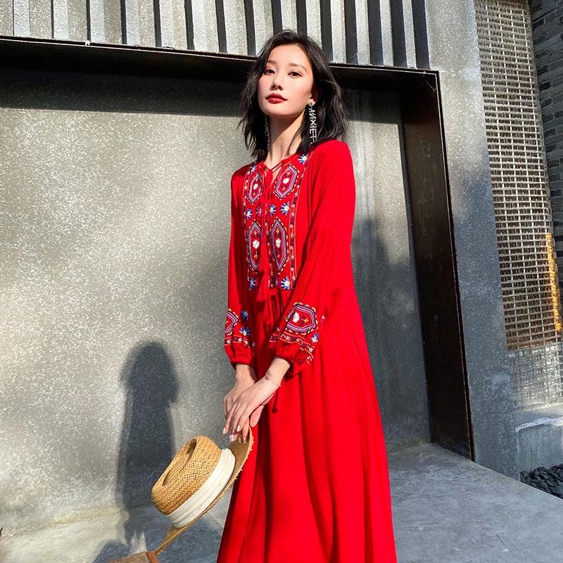 Ethnic Lijiang Dali Embroidered Long Vacation Dress for Women - Slimming Thailand Beach Style (F647)