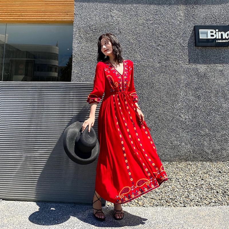 Ethnic Embroidered V-Neck Cotton Linen Dress, Fairy Style with Tie-Up and Swing, Perfect for Travel and Photos - Style 636